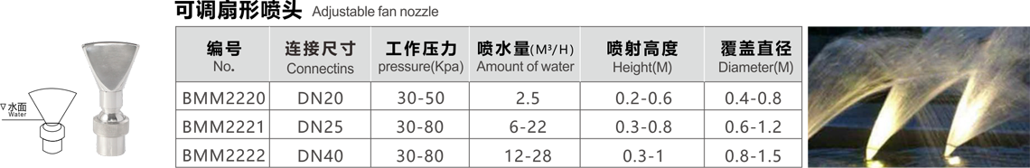 Features: the hemispherical nozzle has less water consumption, less water sound when spraying water, uniform water film, mushroom like shape, also known as mushroom shape, and excellent effect under windless conditions. The nozzle should be installed with valve to adjust the water volume, and the top cap should be adjusted to achieve the best effect of water spray pattern. This kind of nozzle is suitable for various occasions in the fountain.