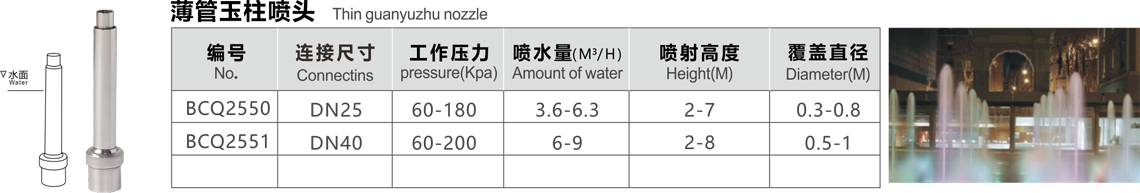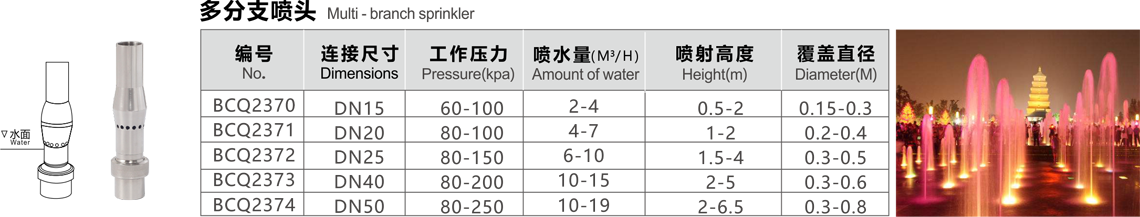 Features: water column is filled with gas, foam is abundant, strong reflection in sunlight, spray water column is coarse, modelling is simple and elegant, suitable for all kinds of high and low jet effects, and can also be used for sound control and program control.