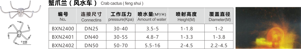 特點(diǎn):旋轉(zhuǎn)蟹爪蘭噴頭又稱風(fēng)水車.噴頭利用水流的噴射力作推動(dòng),使噴頭與水面成45度旋轉(zhuǎn),形狀似蟹爪.內(nèi)有聚四氟乙烯襯套,耐磨使用長(zhǎng).噴頭安裝與水面傾斜45度.專利號(hào):ZL201020231228.9