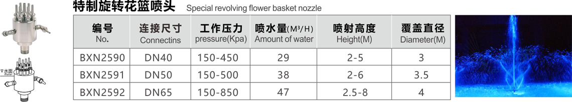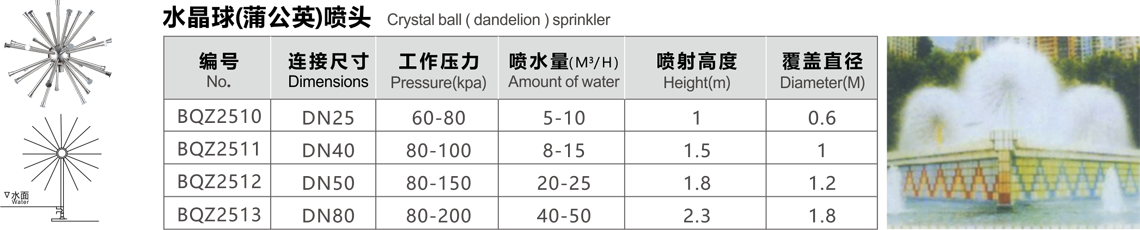 特點(diǎn):噴水時(shí)在陽(yáng)光照射下,酷似水晶寶石,球體停噴時(shí)造型似蒲公英,獨(dú)立或組合成景,銀光閃閃,氣勢(shì)壯觀。對(duì)水質(zhì)要求高,必須裝濾網(wǎng)。燈光效果好。