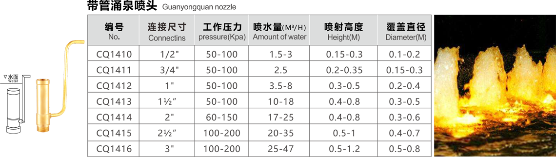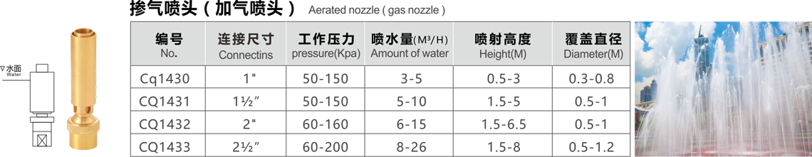 特點(diǎn):水柱中加氣,泡沫豐富,在陽光下反射強(qiáng)烈,噴射的水柱較粗,造型古樸典雅,可以組合各種高低不同的噴射效果,也可以配合音控,程控使用。