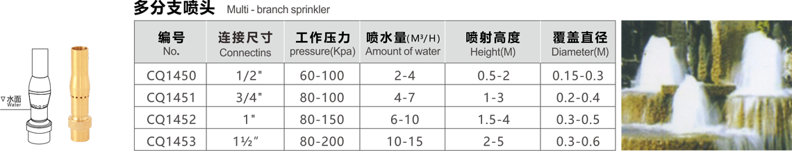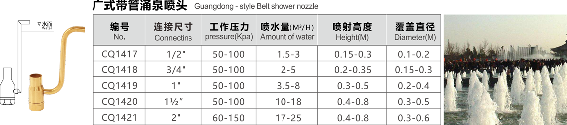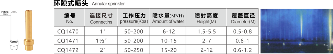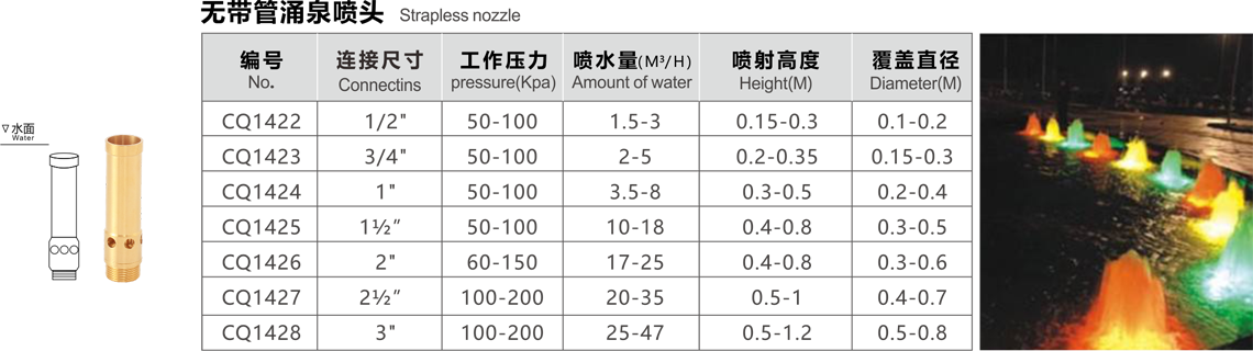 特點(diǎn):這種噴頭系列用射流泵的原理,噴水時將空氣吸入,以少量的水產(chǎn)生豐滿的射流,噴出水柱呈白色不透明狀,反光效果好,調(diào)節(jié)外套的高度可以改變吸入的空氣量,吸入的空氣越多,水柱的顏色越白,泡沫越細(xì)。噴頭有球形接頭,可繞中心線軸向15度轉(zhuǎn)動,它適用于室內(nèi)外的各種噴水池中。