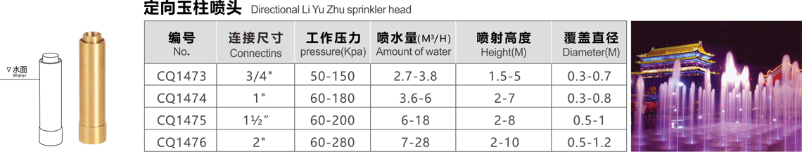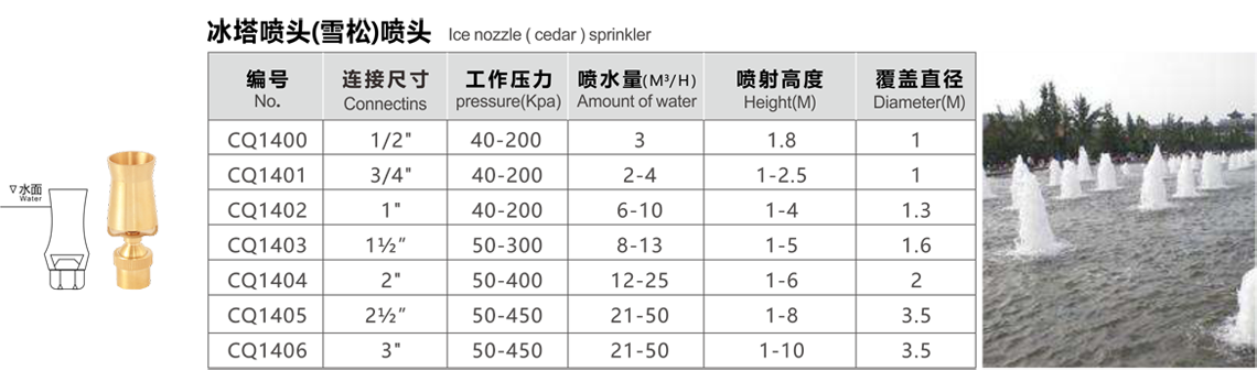 特點(diǎn):水柱垂直向上,粗獷挺拔,形似白玉塔狀,故稱冰塔或雪松,配上燈光,顯出有金塔、藍(lán)塔、紅塔之效果,材料主要有黃銅或不銹鋼等。