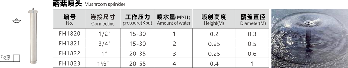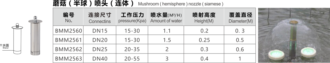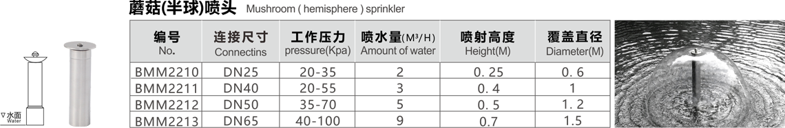 特點(diǎn):半球形噴頭用水量少,噴水時(shí)水聲較小,水膜均勻,形似蘑菇,又名蘑菇形,在無(wú)風(fēng)的條件下效果極佳,這種噴頭應(yīng)安裝閥門調(diào)節(jié)水量,同時(shí)調(diào)節(jié)頂部蓋帽,使噴水花型達(dá)到最佳效果,這種噴頭適用于各種場(chǎng)合的噴水池中。