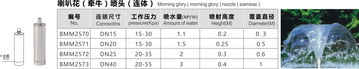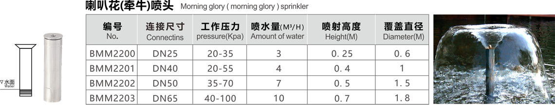 特點(diǎn):喇叭花噴頭又稱牽牛花噴頭,它是利用折射原理,噴水時(shí)形成均勻的薄膜,其形狀在無(wú)風(fēng)和一定的氣壓下可形成完整的喇叭花型,這種噴頭適用于室內(nèi)或庭院的噴水池,用閥門調(diào)節(jié)水量,同時(shí)調(diào)節(jié)頂部蓋帽,使噴水花型達(dá)到最佳效果。
