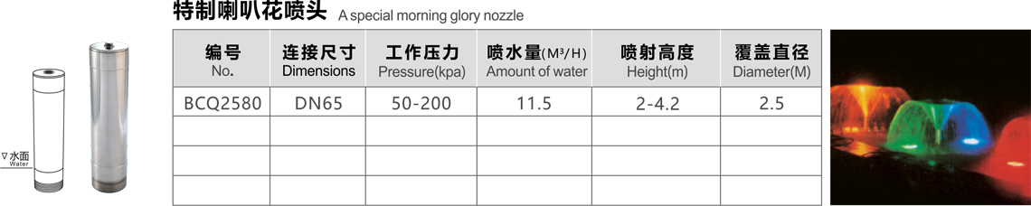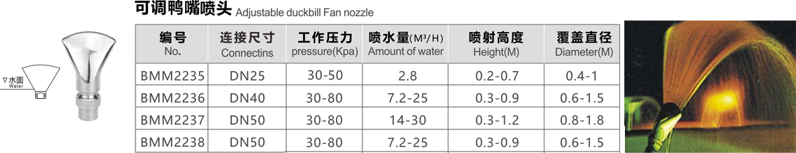 特點(diǎn):噴出水膜均勻,水聲較小,無(wú)風(fēng)時(shí)可形成完整的喇叭供給形,水膜晶瑩透亮。