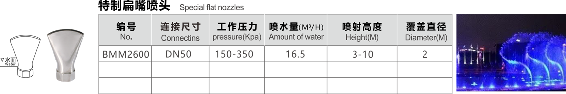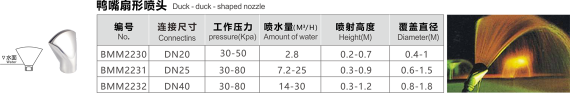 特點(diǎn):噴水時(shí)水流自扁平的噴嘴噴灑,形成扇形的水膜。夜晚在水下彩燈的照射下,猶如五彩繽紛的孔雀開屏。絢麗多彩??蓡为?dú)使用,也可多個(gè)組合造型。