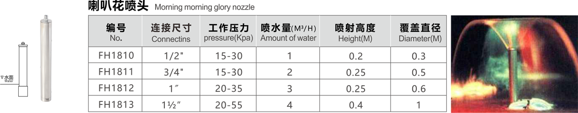 特點(diǎn):喇叭花噴頭又稱牽?;▏婎^,它是利用折射原理,噴水時(shí)形成均勻的薄膜,其形狀在無(wú)風(fēng)和一定的氣壓下可形成完整的喇叭花型,這種噴頭適用于室內(nèi)或庭院的噴水池,用閥門調(diào)節(jié)水量,同時(shí)調(diào)節(jié)頂部蓋帽,使噴水花型達(dá)到最佳效果。