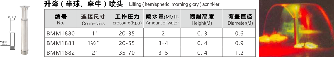 特點(diǎn):升降半球形噴頭是半球形噴頭的一種,噴頭停噴時(shí)噴頭沉入水下,水面空曠平靜。噴水時(shí)噴頭在水的作用下突然從水面露出一個(gè)“半球”造型。