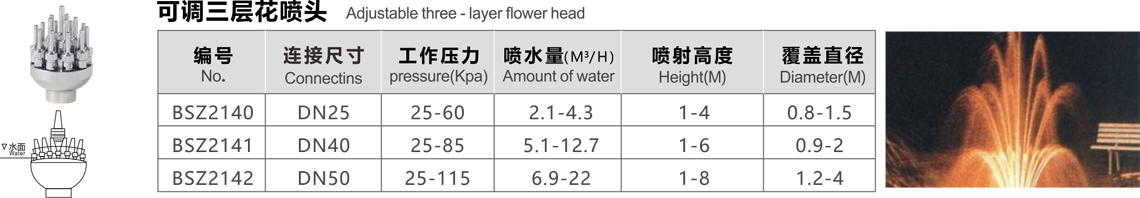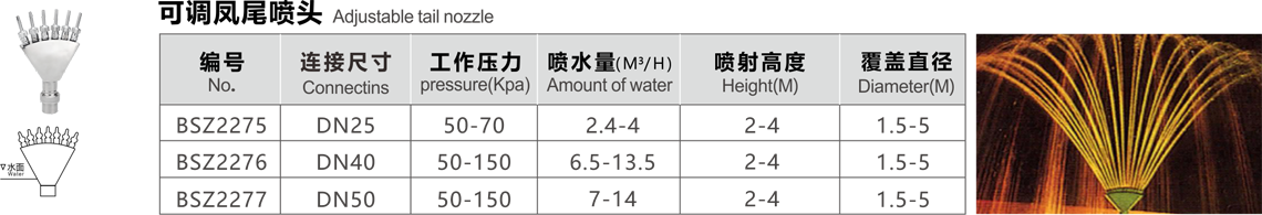 特點(diǎn):在一個(gè)配水室上,安裝一排可調(diào)帶閥小噴嘴.噴水造型如鳳尾,水流舒展柔媚.