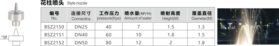特點(diǎn):多個(gè)噴嘴組合噴射,射水時(shí)射流集中,粗壯高達(dá),氣勢宏偉,常用來作噴水池中心水柱的主噴頭。