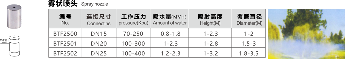 特點(diǎn):霧狀噴頭也稱噴霧噴頭,它噴出的水滴非常細(xì)小,成為霧狀,在陽光照射下可形成七色彩虹。因噴嘴構(gòu)造差異,噴出的水姿也有不同,噴水時(shí)噪聲小,用水量小,一般安裝在雕像周圍。另外,在隔熱、防塵工程中也廣泛應(yīng)用。