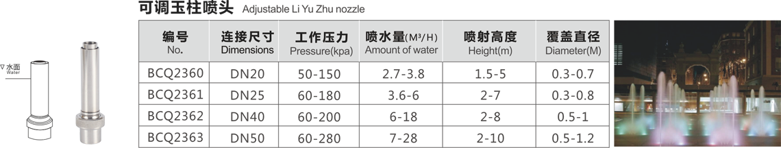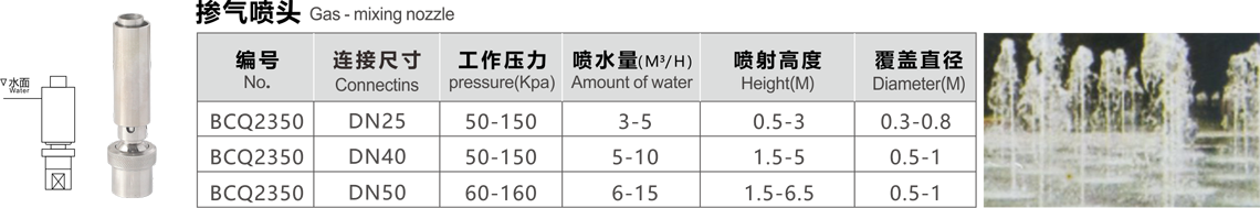 特點(diǎn):這種噴頭系列用射流泵的原理,噴水時(shí)將空氣吸入,以少量的水產(chǎn)生豐滿的射流,噴出水柱呈白色不透明狀,反光效果好。調(diào)節(jié)外套的高度可以改變吸入的空氣量,吸入的空氣越多,水柱的顏色越白、泡沫越細(xì)。噴頭有球形接頭,可繞中心線軸向15度轉(zhuǎn)動(dòng)。它適用與室內(nèi)外的各種噴水池中。