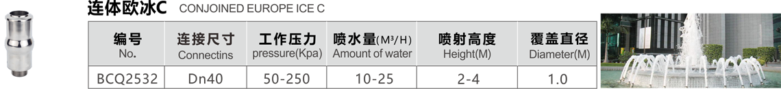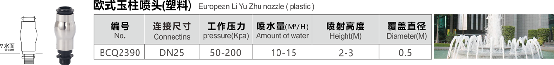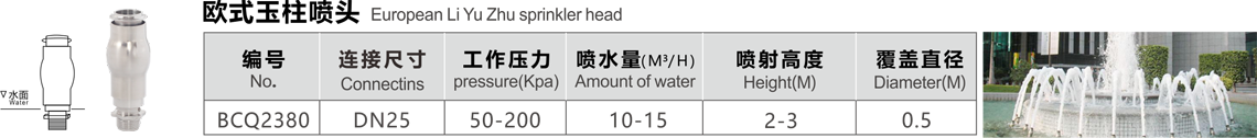 特點(diǎn):水柱中加氣,泡沫豐富,在陽(yáng)光下反射強(qiáng)烈,噴射的水柱較粗,造型古樸典雅,適合各種高低不同的噴射效果,也可配合音控,程控使用。