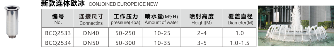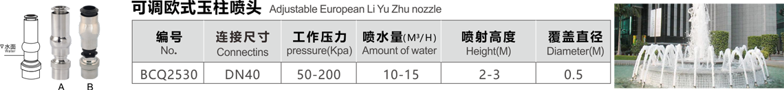 特點(diǎn):水晶泡沫噴頭,水柱加氣,泡沫豐富,在陽(yáng)光下反射強(qiáng)烈,噴射的水柱較粗,造型淳樸典雅,常以組合彩帶、水幕、水橋、花籃等造型,上下調(diào)節(jié),可自動(dòng)調(diào)節(jié)水的流量。