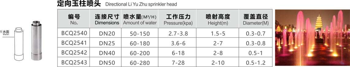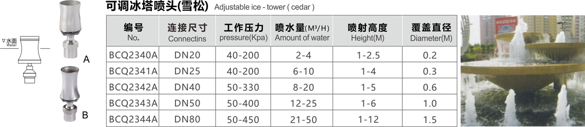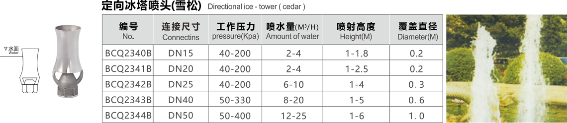 特點(diǎn):水柱垂直向上,粗獷挺拔,形似白玉塔狀,故稱冰塔或雪松,配上燈光,顯出有金塔、藍(lán)塔、紅塔之效果。材料主要有黃銅或不銹鋼等。