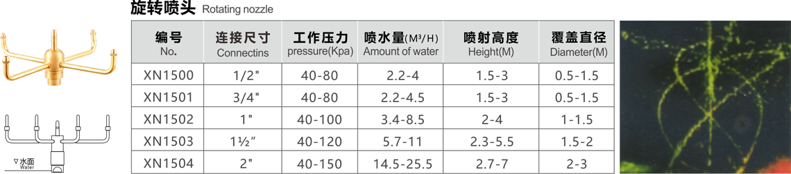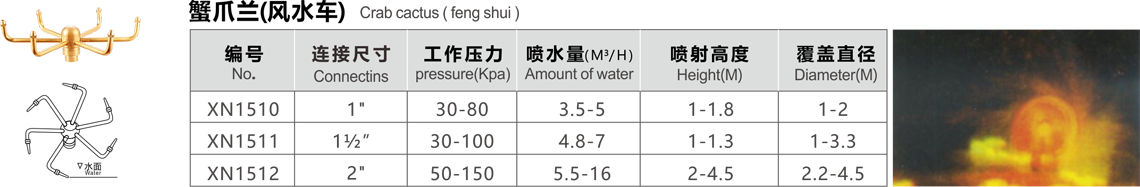 特點:旋轉(zhuǎn)蟹爪蘭噴頭又稱風(fēng)水車。噴頭利用水流的噴射力作推動,使噴頭與水面夾45度旋轉(zhuǎn),形狀似蟹爪。噴頭安裝與水面傾斜45度。