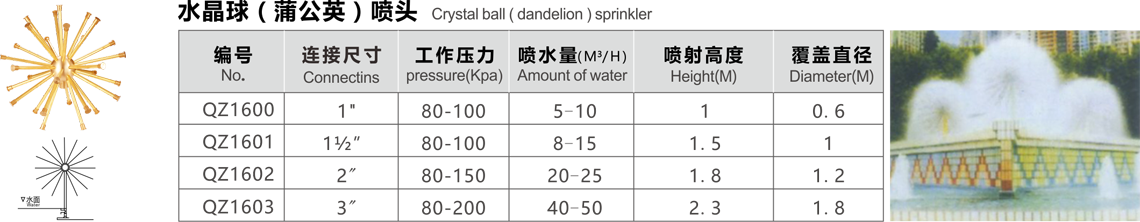 特點(diǎn):噴水時(shí)在燈光照射下,酷似水晶寶石,球體停噴時(shí)造型似蒲公英,獨(dú)立或組合成景,銀光閃閃,氣勢(shì)壯觀。對(duì)水質(zhì)要求高,必須裝濾網(wǎng),燈光效果好。